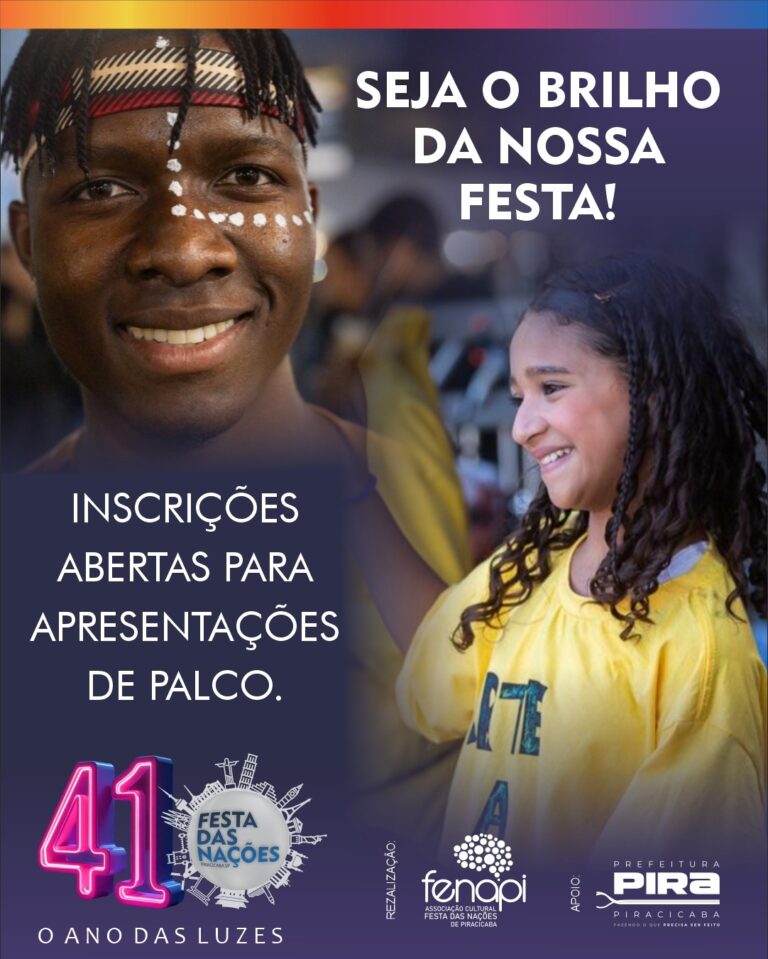 Atenção artistas, orquestras, grupos folclóricos e cias de danças artísticas, chegou a hora de fazer parte da 41a edição da Festa das Nações de Piracicaba! Se você leva a Cultura no coração e quer brilhar no palco principal, essa é…